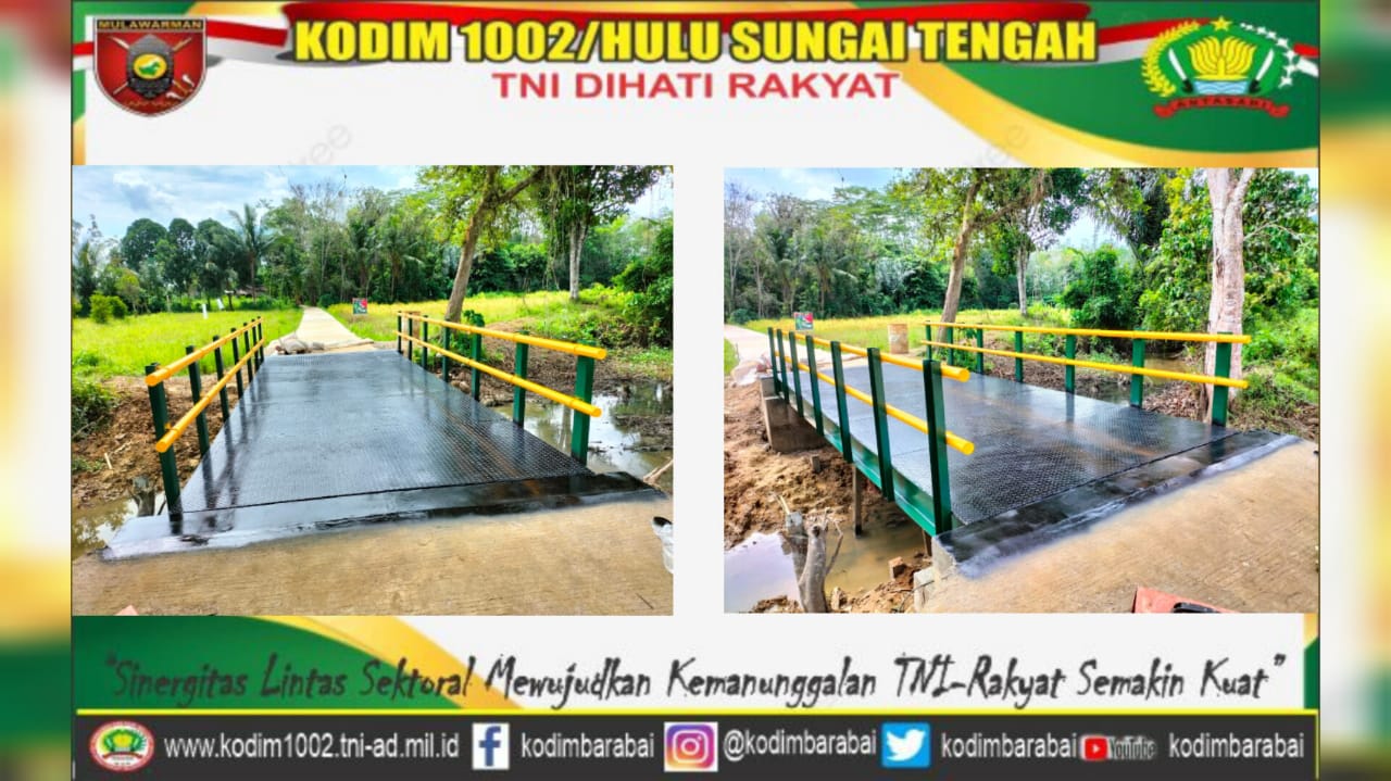 Barabai,Metrotalenta.online–Akhirnya Satgas TMMD Ke-116 Rampungkan Pembangunan Jembatan Besi 100 Persen,Akhirnya TNI Manunggal Membangun Desa (TMMD) ke-116 Kodim 1002/HST merampungkan pembangunan jembatan besi spanjang 6 meter lebar 2,4 meter di Desa Hapulang kecamatan Haruyan Kabupaten Hulu Sungai Tengah, Rabu (07/6/2033).