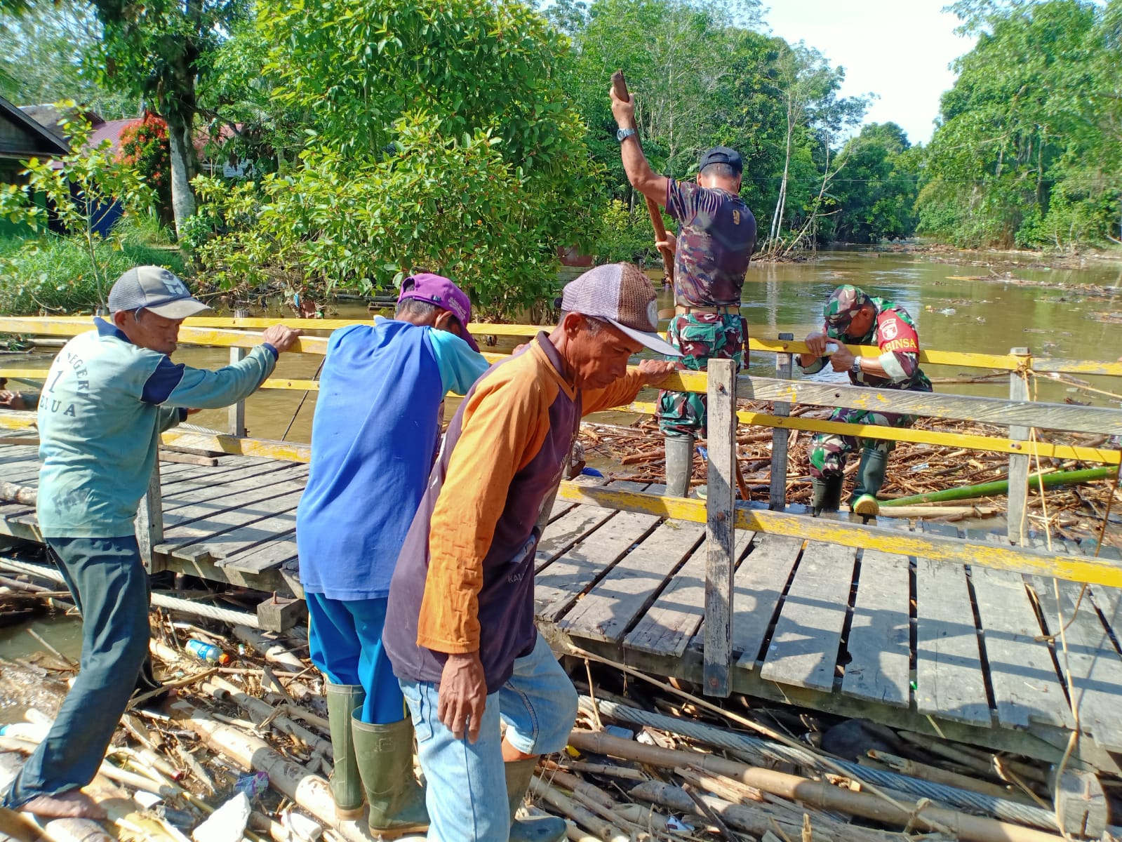 Anggota Koramil 1002-05/Pandawan dipimpin oleh Serka Rahmadhani bersama warga masyarakat dan unsur dinas terkait seperti Dinas PU, Satpol PP, Dinas LH Kab.HST, Tagana, dan Ormas serta aparat desa Masiraan melaksanakan pembersih sampah sungai.