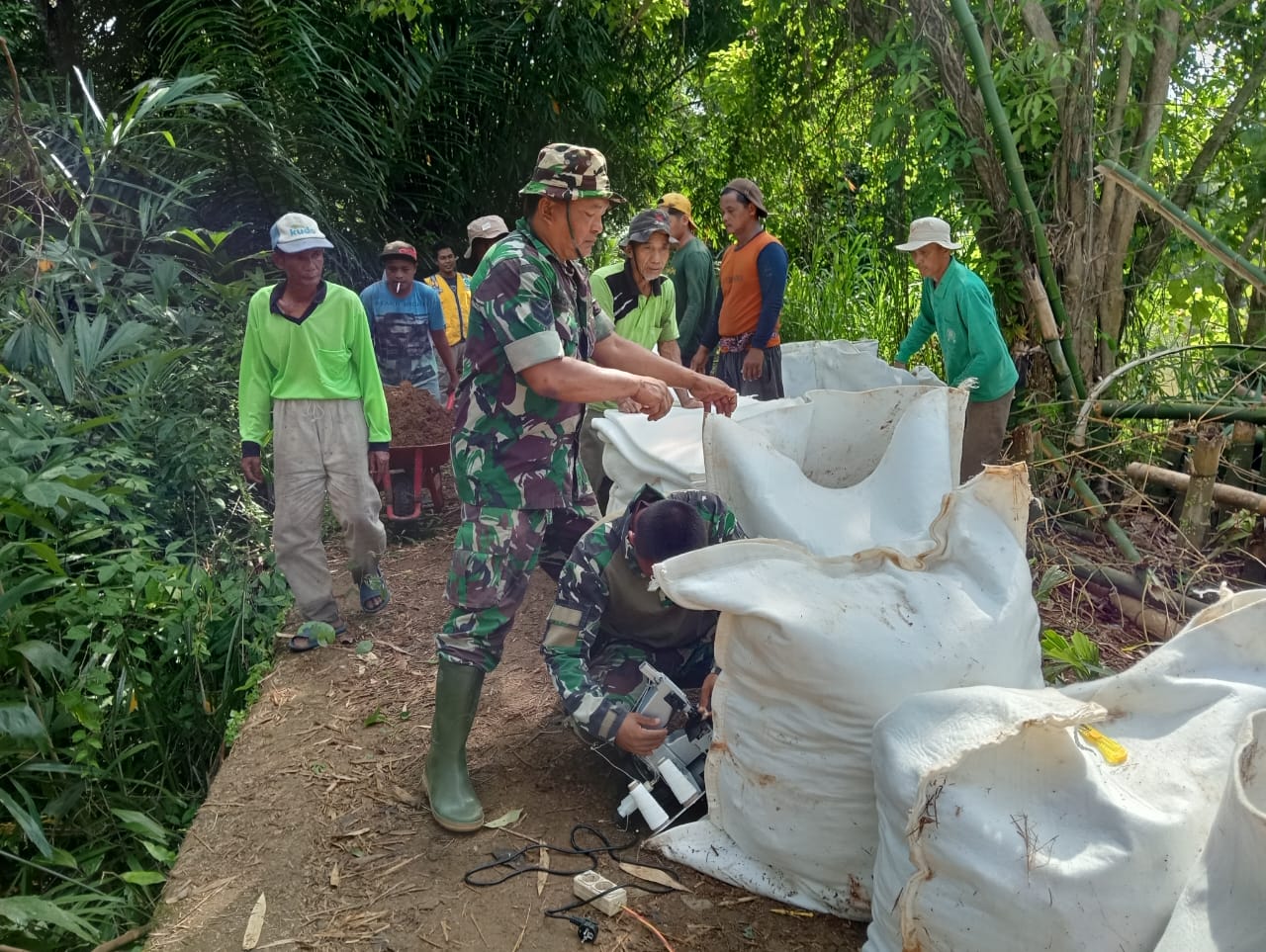 Anggota Koramil 1002-02/Batang Alai Utara bergotong royong memperbaiki tanggul sungai menggunakan karung plastik yang diisi tanah untuk memperbaiki tanggul yang longsor,