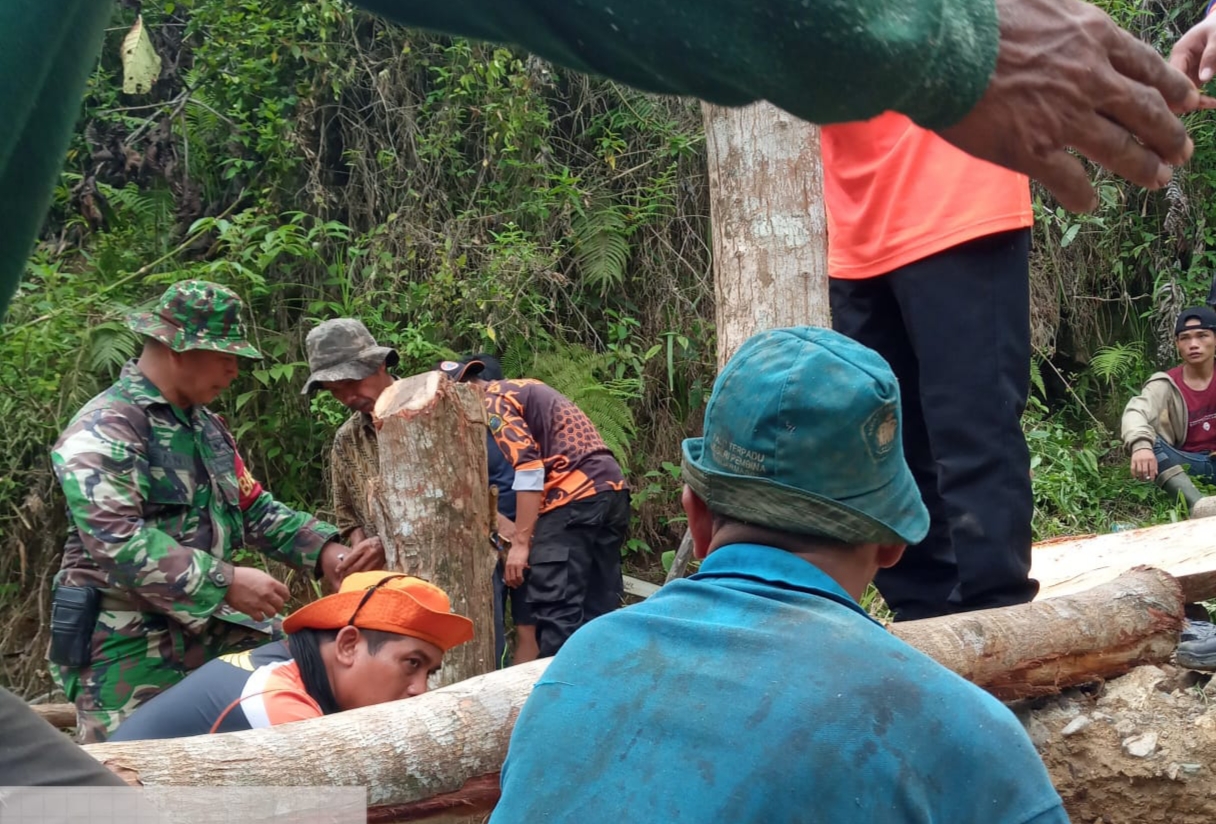 Guna mengatasi kesulitan masyarakat, Babinsa Koramil 1002-07/Batu Benawa Sertu Sanu bersama BPBD Kab.HST, Polri, Relawan dan warga masyarakat gotong royong membangun jembatan darurat, di desa Patikalain Kecamatan Hantakan Kabupaten Hulu Sungai Tengah.Sabtu (18/03).