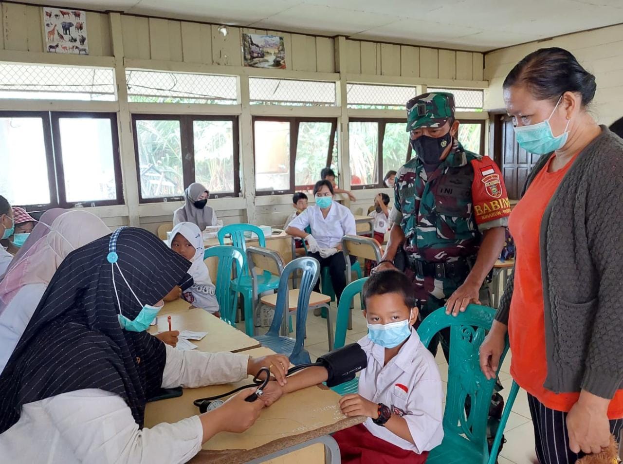 Tabalong,Metrotalenta.online–Babinsa Koramil 1008-02/Haruai Pelda Basuki melaksanakan Pendampingan vaksinasi covid-19 di sejumlah sekolah dasar, diantaranya SD 1 dan 2 Desa Pangelak.