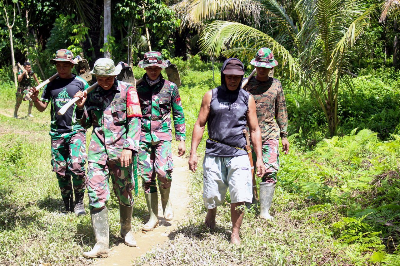 Metrotalenta.online–Terlihat Anggota Satgas TMMD ke-114 Kodim 1306/Kota Palu bersama masyarakat Desa Khatulistiwa Kecamatan Tinombo Selatan Kabupaten Parigi Moutong berjalan kaki menuju lokasi kerja pembukaan jalan. Minggu, (14/8/2022).