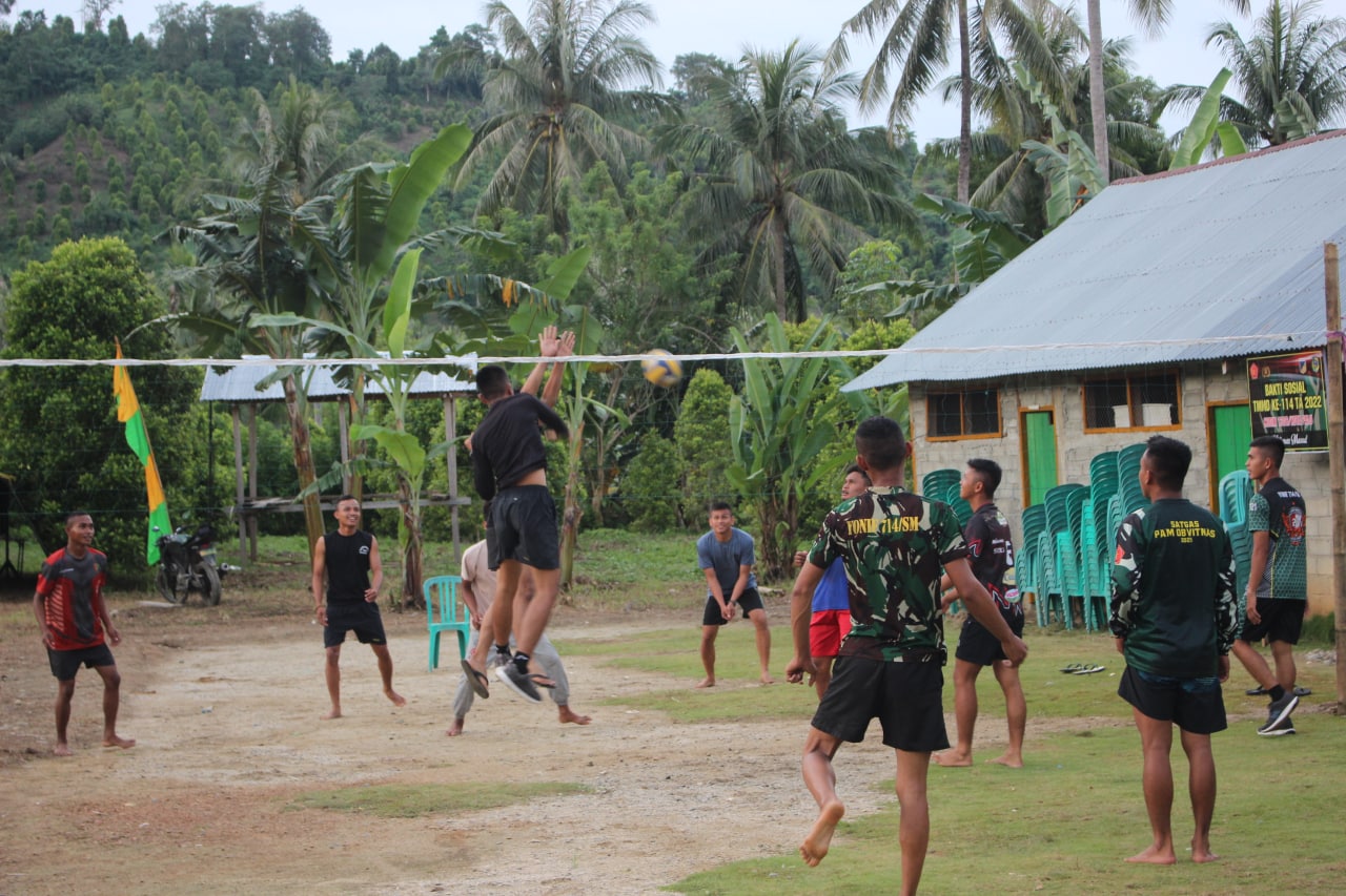 Metrotalenta.online–Anggota Satgas TMMD Ke-114 Kodim 1306/Kota Palu mengisi waktu luang saat sore hari untuk mengikuti olahraga bola voli bersama warga yang berada di Desa Khatulistiwa, Kecamatan Tinombo Selatan, Kabupaten Parigi Moutong. Jumat (6/8/2022).