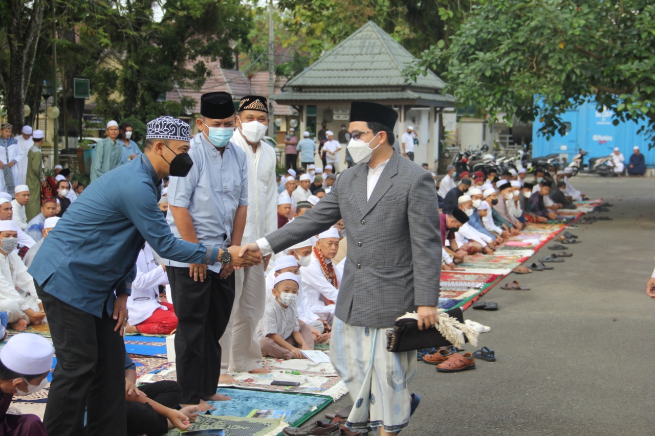 Lebih lanjut Bupati menyampaikan, maka dihari Raya Idul Fitri yang berbagia ini mari kita mengumandangkan takbir, tahmid dan tasbih sebagai wujud rasa syukur kita kepada Allah SWT atas kemenangan kita, menang dalam memerangi hawa nafsu dan berjuang melawan segala godaan selama Ramadhan, serta menang dari serangan covid 19 yang merajalela.
