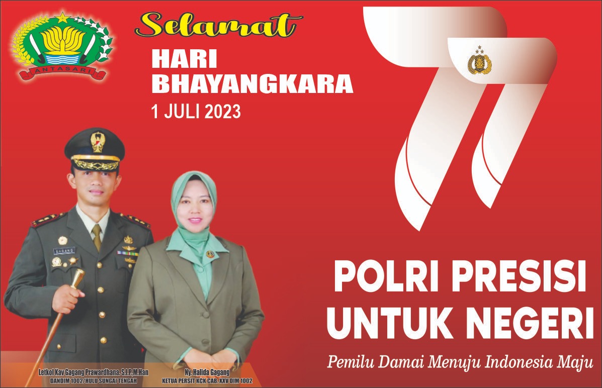 Barabai,metrotalenta.online–Dandim 1002/HST Ucapkan Selamat Hari Bhayangkara Ke-77,Bertepatan dengan Hari Ulang Tahun (HUT) Bhayangkara ke-77 pada tanggal 1 Juli 2023, Komandan Kodim 1002/HST Letkol Kav Gagang Prawardhana. S.I.P.,M.Han beserta keluarga besar Kodim 1002/HST dan Ketua Persit Kartika Chandra Kirana Cabang XXV Dim 1002 Koorcab Rem 101 PD VI/Mulawarman Ny. Halida Gagang menyampaikan ucapan Selamat Hari Bhayangkara ke-77 tahun 2023. Sabtu (01/7/2023).