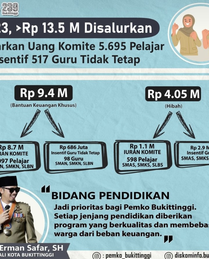 Wali Kota Bukittinggi, Erman Safar, menjelaskan, bidang pendidikan, juga jadi prioritas bagi Pemko Bukittinggi. Setiap jenjang pendidikan diberikan program yang berkualitas dan membebaskan warga dari beban keuangan. Dengan dana dari APBD itu, 5.695 pelajar SMA dan SLB se Kota Bukittinggi bebas dari iuran komite dan 517 guru non PNS, mendapatkan dana insentif serta THR.
