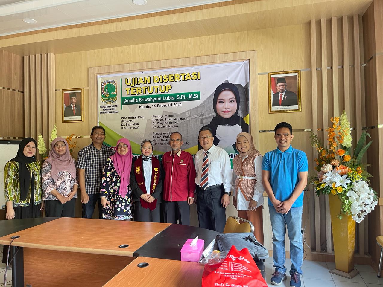 Sementara itu, Ketua Program Doktor S3 Biologi Prof Dr Erizal Mukhtar mengatakan Amelia Sriwahyuni Lubis ini merupakan lulusan ke-14 S3 Biologi Unand. Dan dia adalah lulusan pertama sejak S3 Biologi dengan akreditasi Unggul.