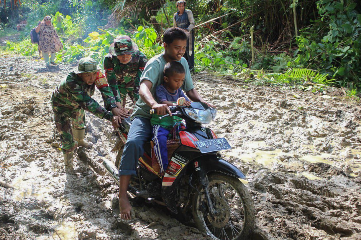 Metrotalenta.online–Akses jalan berlumpur yang menyulitkan warga melintas di area perkebunan untuk melaksanakan aktifitas perekonomian serta akses menuju sasaran pembukaan jalan TMMD 114 Kodim 1306/Kota Palu, tidak menghalangi TNI dan warga untuk melaksanakan peninbunan jalan tersebut di Desa Siaga, Kecamatan Tinombo Selatan, Kabupaten Parimo.