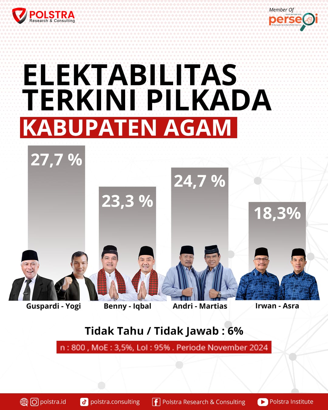 Menurut founder Polstra Research and Consulting Yovaldri Ricki, elektabilitas Guspardi Gaus di Pilkada Agam, menjelang akhir masa kampanye adalah 27,7 persen, Paslon Andri Warman – Martias Wanto 24,7 persen, dan justru Benni Warlis – M Iqbal 23,3 persen di posisi ke empat Irwan – Asra 18,3 persen.