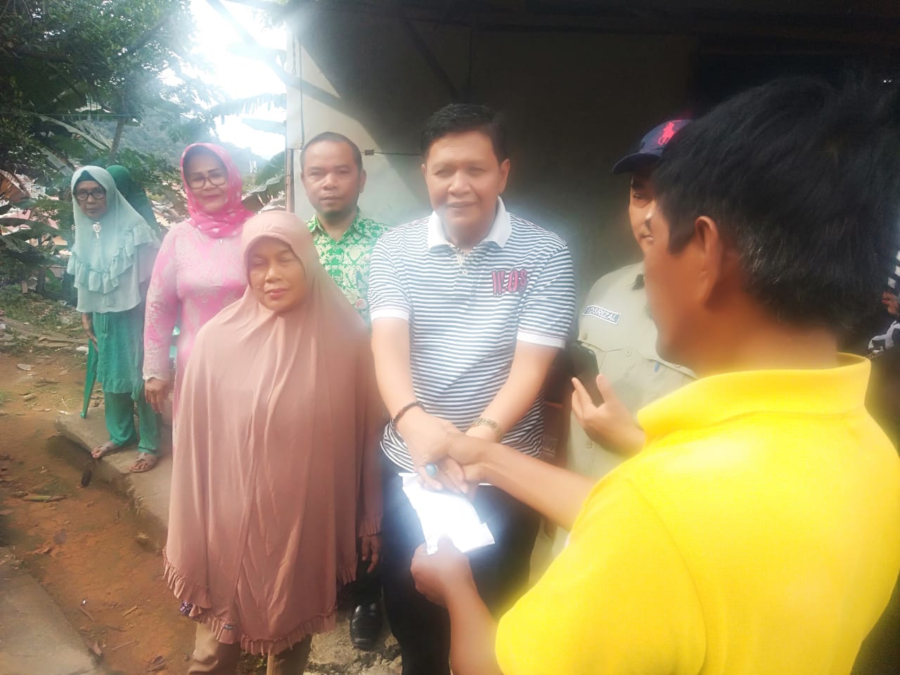 Pada kesempatan itu ,Irwan Basir menyerahkan bantuan dalam bentuk uang tunai.beberapa Dus Pop Mie ,beras serta air mineral .bantuan ini diterima langsung oleh Masral dengan disaksikan oleh lurah Rawang , RT dan RW setempat