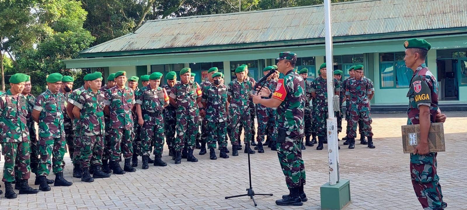 Dalam kesempatan tersebut Dandim menyampaikan kepada seluruh anggota untuk tetap bersemangat dalam menjalankan tugas sesuai fungsinya masing-masing dan jangan buat pelanggaran yang akan merugikan diri dan nama baik satuan.