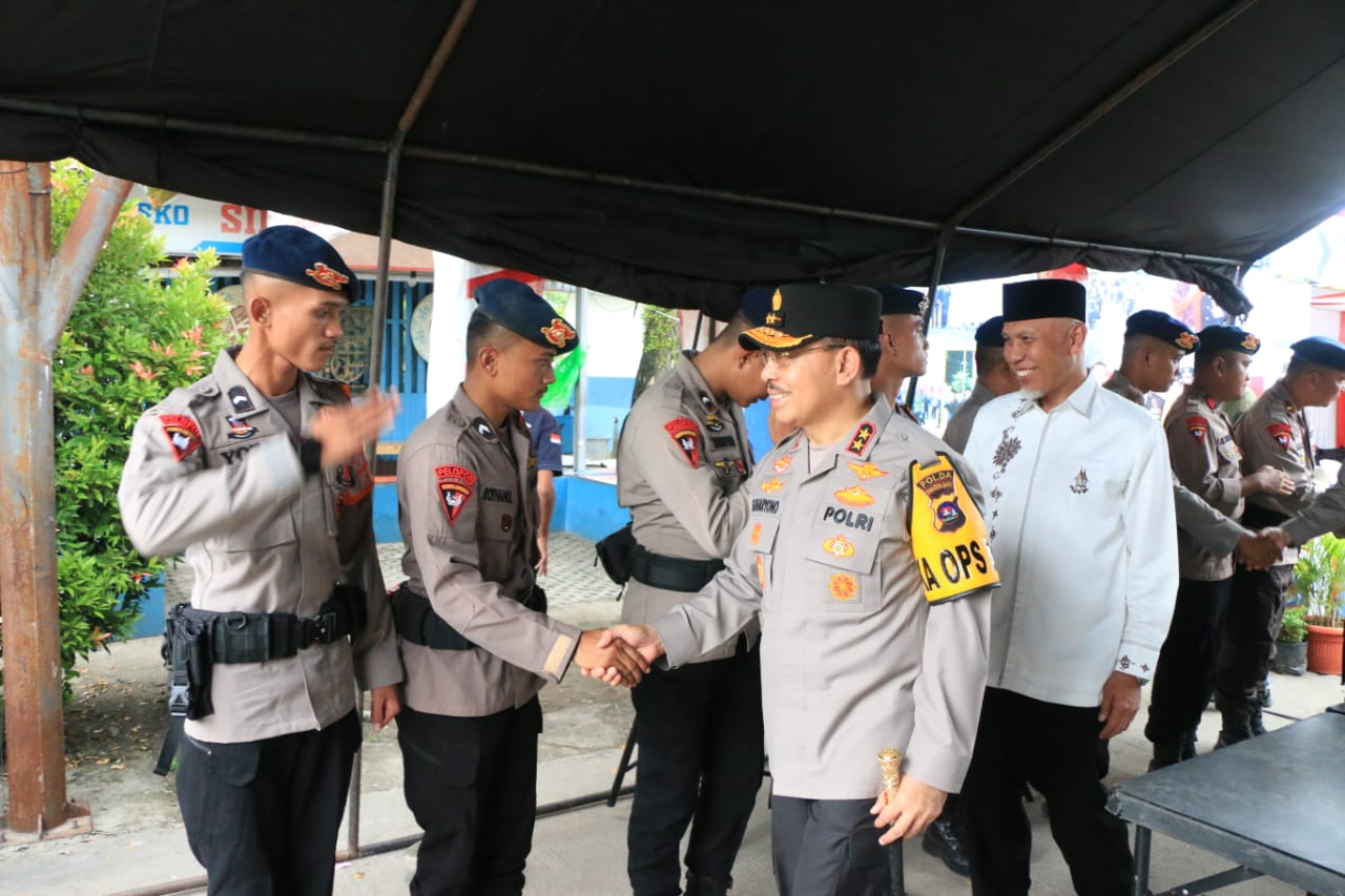 Sumbar,metrotalenta.online–Kapolda Sumbar Irjen Pol Suharyono, S.I.K., S.H., bersama Gubernur Sumatera Barat H. Mahyeldi, S.P., dan Wakapolda Sumbar, beserta Forkopimda Sumatera Barat, melakukan pengecekan kesiapan personel TNI-Polri di lapangan dan di pos pengamanan Idulfitri serta Pos Terpadu Idulfitri yang berada di danau Chimpago Kota Padang, Sumatera Barat, Selasa (9/4/2024).