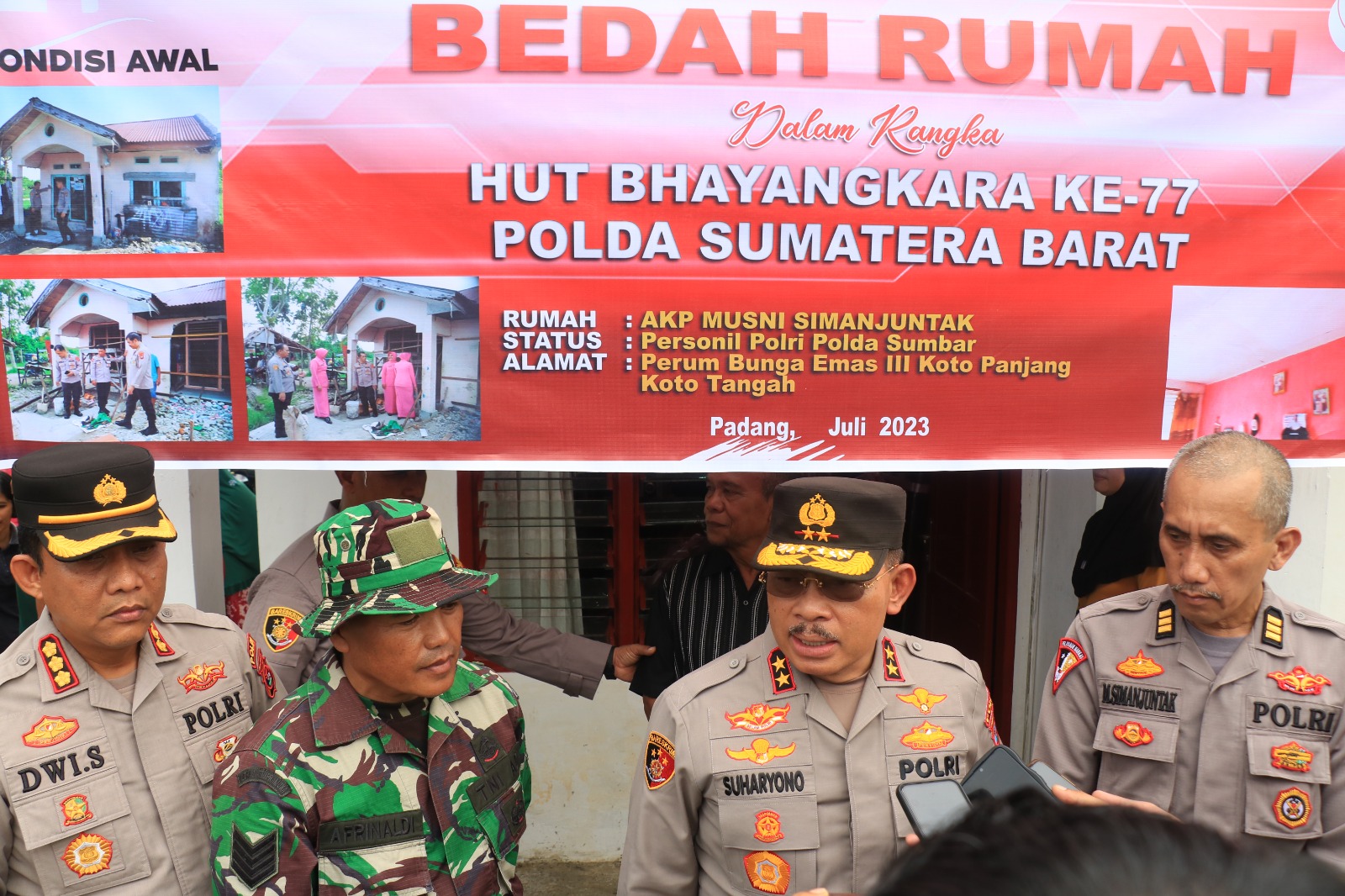 Anjangsana bedah rumah personel tersebut dipimpin oleh Kapolda Sumbar Irjen Pol Suharyono, S.Ik. SH, dengan diikuti oleh Pejabat Utama Polda Sumbar, Ketua Bhayangkari Daerah Sumbar Ny. Iis Suharyono dan Pengurus Bhayangkari Daerah Sumbar, Rabu (12/7).)