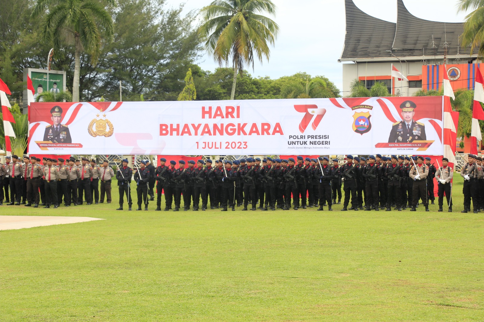 Sumbar,metrotalenta.online–Kapolda Sumbar Pimpin Upacara Hari Bhayangkara Ke-77 Di Istana Gubernur,Kepala Kepolisian Daerah Sumatera Barat (Kapolda Sumbar) Irjen Pol Suharyono, S.Ik. SH memimpin upacara peringatan Hari Bhayangkara ke-77 tahun 2023, Sabtu (1/7).