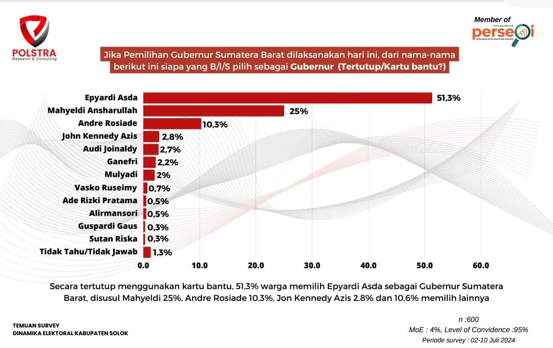 Survei Polstra Research & Consulting dilakukan pada 2 hingga 10 Juli 2024 di Kabupaten Solok. Survei tersebut melibatkan 600 responden. Penarikan sampel dilakukan dengan menggunakan metode Multistage Random Sampling. Tingkat kepercayaan survei tersebut 95 persen, sedangkan margin of eror-nya 4 persen.