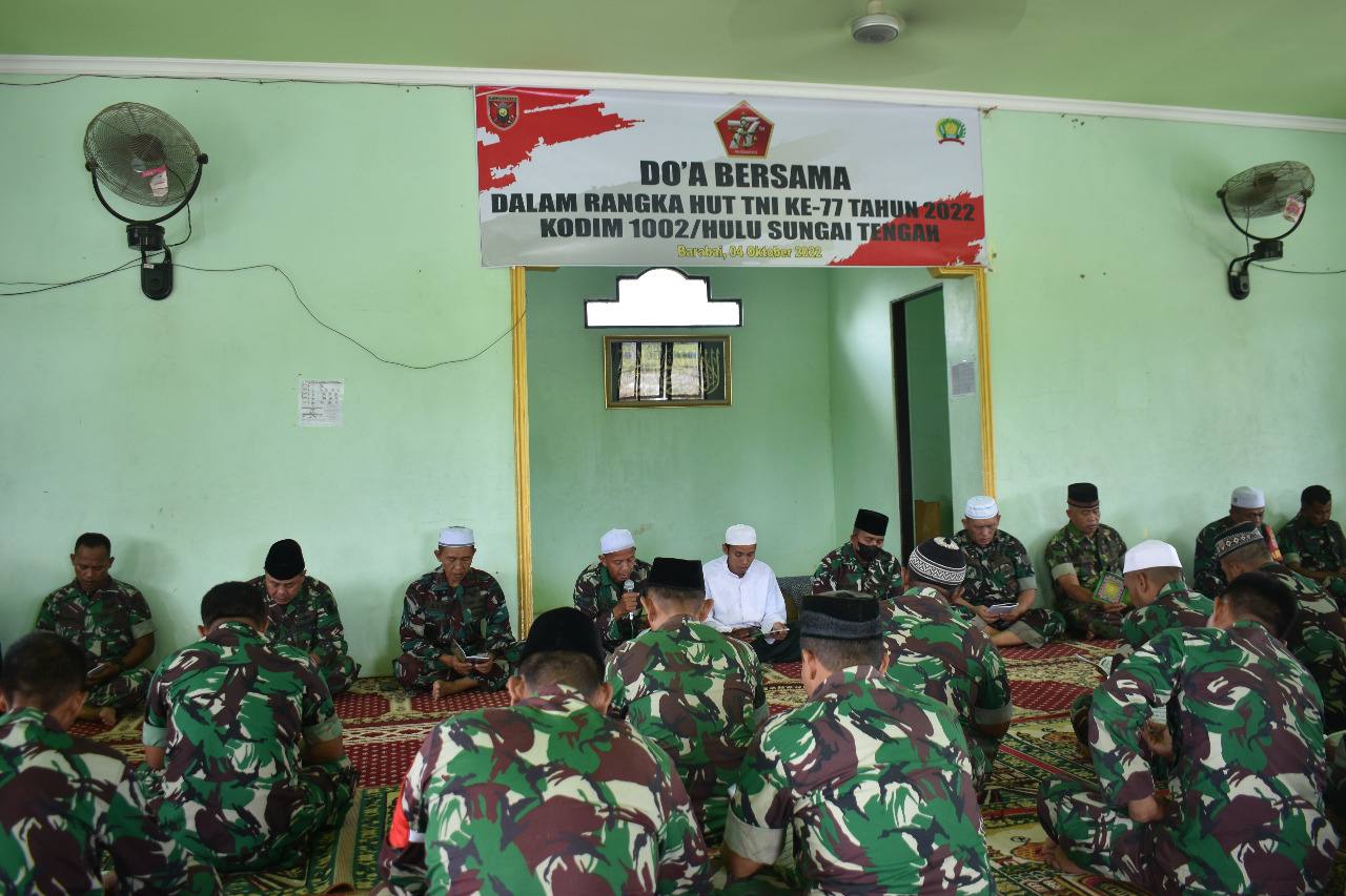 Barabai,Metrotalenta.online–Rangkaian peringatan HUT TNI ke-77 tahun 2022 di Kodim 1002/HST terus berlanjut dari pembersihan Taman Makam Pahlawan, Ziarah Nasional hingga gelaran doa bersama di Mushola At-Taqwa Asrama Kodim 1002/HST Kompleks Beringin Jl. Lapangan Pelajar Kelurahan Barabai Darat Kecamatan Barabai Kabupaten Hulu Sungai Tengah (HST) Kalimantan Selatan.Selasa (04/10) siang.