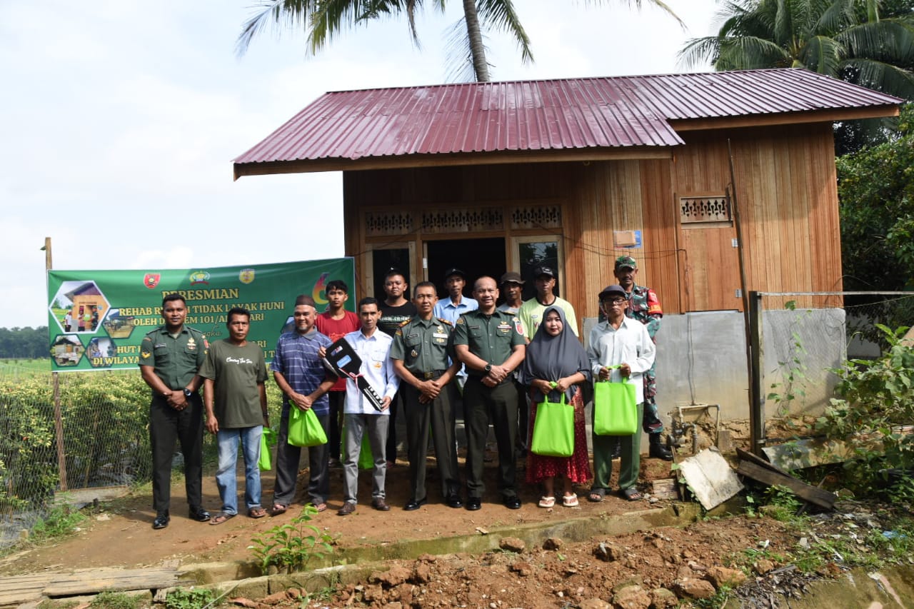 Penyerahan bedah rumah tidak layak huni di wilayah Kodim 1002/Hulu Sungai Tengah dalam rangka HUT ke-62 Korem 101/Antasari tahun 2023, diserahkan oleh Pasiterdim 1002/HST Kapten Inf Moh. Alip Suroso mewakili Dandim 1002/HST Letkol Inf Fery Perbawa.S.Hub.Int.,M.Han