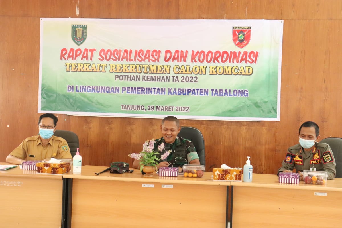 Tabalong,Metrotalenta.online–Komandan Kodim 1008/Tabalong Letkol Inf Dhuwi Hendradjaja. S.Sos.M.I.Pol mensosialisasikan tentang Rekrutmen Calon Komponen Cadangan Tahun 2022 di ruang kelas Badan Kepegawaian dan Pengembangan Sumber Daya Manusia (BKPSDM), Tanjung Selatan, Kelurahan Mabuun, Kecamatan Murung Pudak, Kabupaten Tabalong. Selasa (29/03).