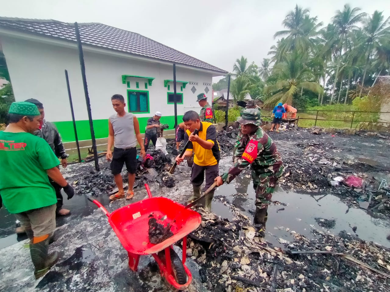 Guna meringankan beban korban musibah kebakaran, TNI-Polri dan Pemerintah Daerah HST serta relawan membersihkan puing-puing sisa kebakaran milik saudara Adit. Jum’at (09/09/2022)