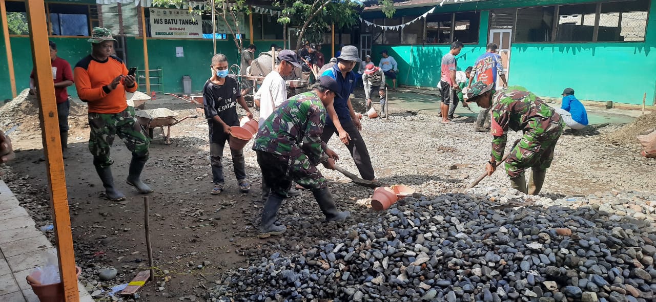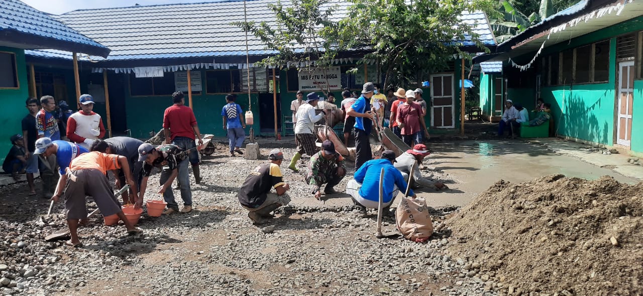 Barabai,metrotalenta.online–Babinsa Koramil 1002-01/Batang Alai Selatan Serda Rahmad Jubair dan Koptu Erly Seprianto bersama masyarakat desa Batu Tangga melaksanakan gotong royong pengecoran halaman Madrasyah Islam Swasta Batu Tangga Kecamatan Batang Alai Timur Kab. Hulu Sugai Tengah. Sabtu (25/11/2023).