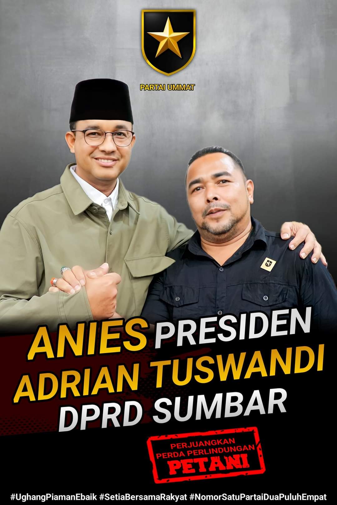 “Semua disampaikan rakyat, persis menjadi teriakan Capres 01 Anies Baswedan di semua media, pendidikan murah, BPJS gratis, lapangan pekerjaan murah diperoleh, kesehatan untuk semua, Bansos plus yaitu untuk pemenuhan kebutuhan masyarakat. Juga soal pupuk dan infrastruktur, juga bagi ambo bisa pagi anak indak manangih karena menahan lapar sudahlah. Harapan itu semua bisa terealisasi, jika pemilih pilih Anies Baswedan Presiden dan coblos Adrian Tuswandi DPRD Provinsi dari Partai Ummat Dapil Sumbar 2,”ujar Adrian.