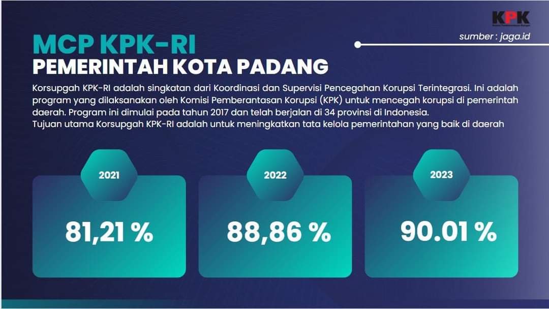Angka MCP di Pemko Padang selama tiga tahun belakangan terus membaik. Berdasarkan data yang dirilis KPK RI, tahun 2021 nilainya berada di angka 81,21%. Kemudian di tahun 2022 di angka 88,86%. Dan di tahun 2023 kemarin di angka 90,01%.
