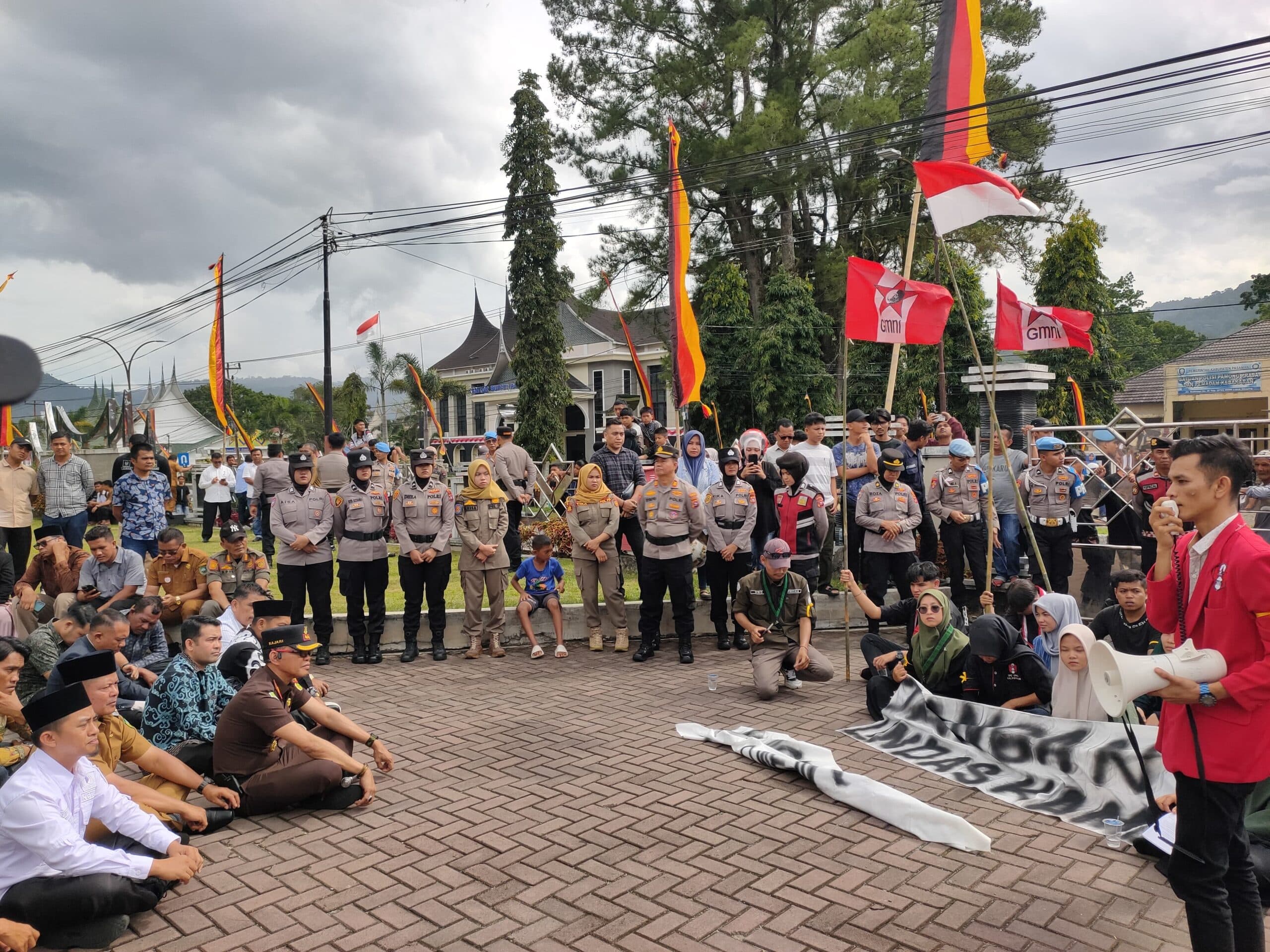 Di tengah kerumunan massa, suara lantang Ketua DPC GMNI Pasaman Andan Hasayangan Hasibuan didampingi ketua umum HMI Cabang Pasaman Lelti Saputri Yeni menjadi sorotan.