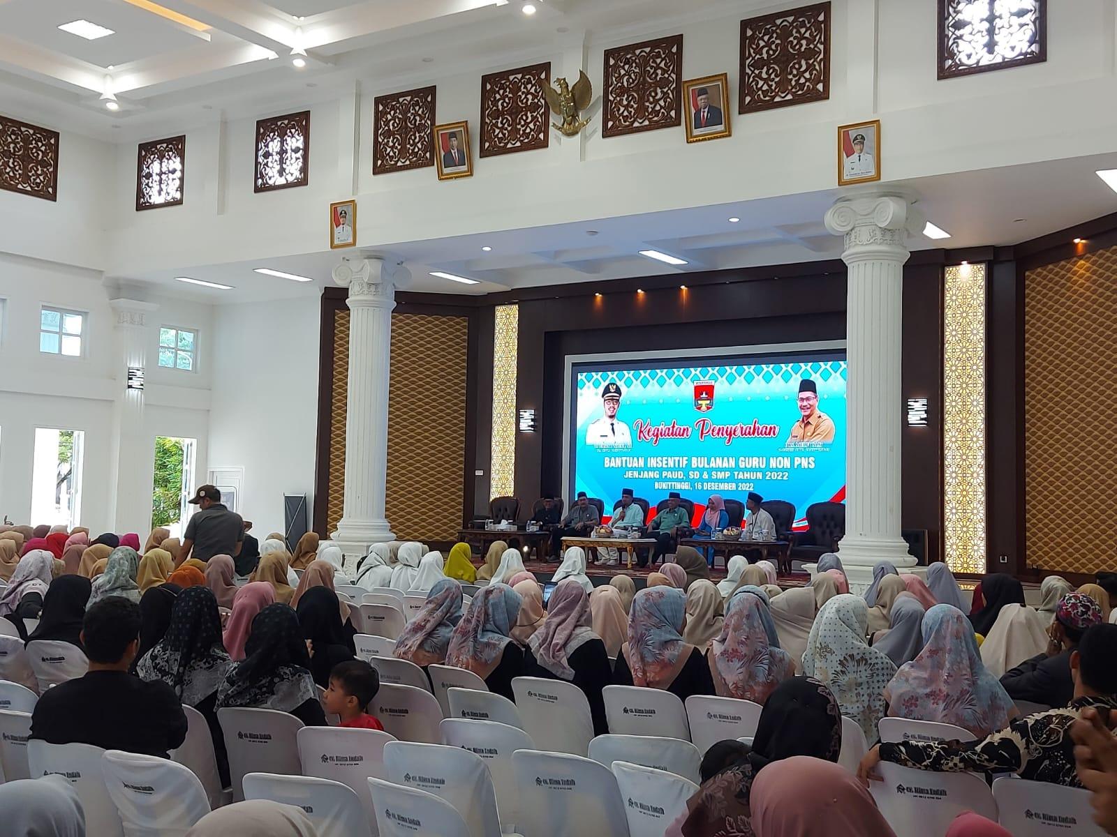 BUKITTINGGI,Metrotalenta.online,– Pemerintah Kota Bukittinggi serahkan honorarium semester 2, untuk guru non-PNS se-Kota Bukittinggi. Honor diberikan simbolis oleh Wali Kota, di balairung rumah dinas wako, Jumat (16/12/2022).