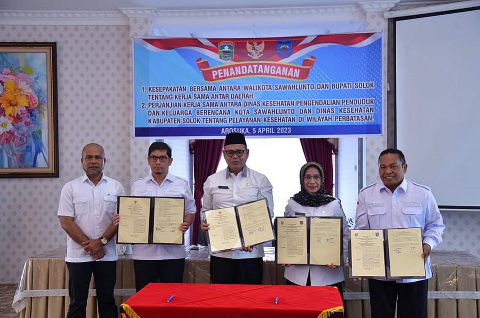 Penandatangan kesepakatan bersama itu dilakukan oleh Wali Kota Sawahlunto Deri Asta dan Bupati Solok Epyardi Asda, diikuti oleh Plt Kepala Dinas Kesehatan Pengendalian Penduduk dan KB (Dinkesdalduk KB) Kota Sawahlunto Dr.dr. Ambun Kadri, MKM, dan Kepala Dinas Kesehatan Kabupaten Solok Zulhendri, di Balairung Rumah Dinas Bupati Solok, pada Rabu 05 April 2023.