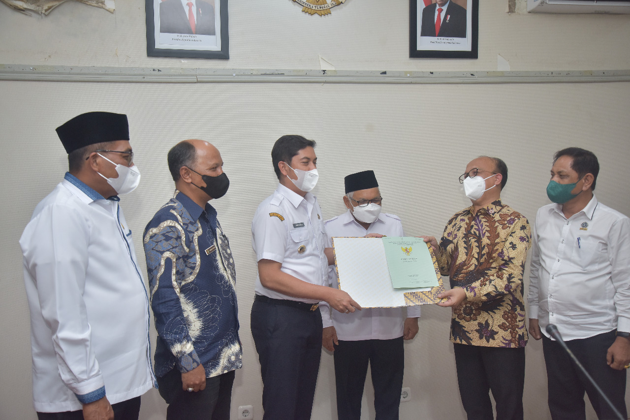 Sertifikat tanah seluas tiga hektar yang berlokasi di Parambahan Desa Batu Tanjung Kecamatan Talawi diserahkan langsung oleh Wali Kota Sawahlunto Deri Asta, Rabu 23 Maret 2022 kepada Sekretaris Jenderal Kemnaker Anwar Sanusi yang datang ke Sawahlunto bersama sejumlah jajarannya.
