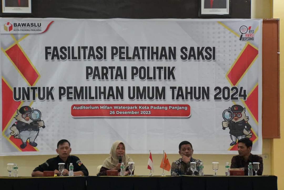 PADANG PANJANG, — Badan Pengawas Pemilu (Bawaslu) Kota Padang Panjang gelar Pelatihan Saksi Partai Politik se-Kota Padang Panjang di Auditorium Mifan Waterpark, Selasa (26/12).