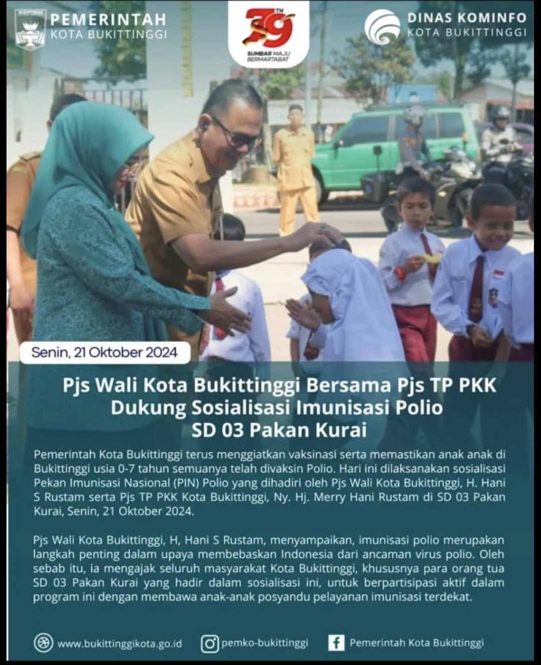 Hari ini dilaksanakan sosialisasi Pekan Imunisasi Nasional (PIN) Polio yang dihadiri oleh Pjs Wali Kota Bukittinggi, H. Hani S Rustam serta Pjs TP PKK Kota Bukittinggi, Ny. Hj. Merry Hani Rustam di SD 03 Pakan Kurai, Senin, 21 Oktober 2024.