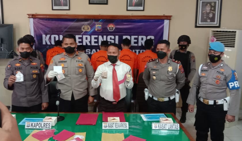 Lebih lanjut, Kapolres Ricardo Condrat Yusuf menjelaskan terkait barang bukti yang berhasil disita dari lima tersangka tersebut diantaranya, 4 paket kecil diduga Narkotika jenis Shabu, 3 paket kecil diduga Narkotika jenis ganja , Seperangkat alat hisap, 3 buah handphone, 5 unit motor dan uang sejumlah Rp500 ribu