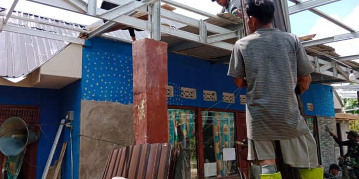 Meski dibawah terik matahari, dengan penuh semangat anggota Satgas TMMD bersama warga masyarakat tetap melakukan pemasangan atap musholla.