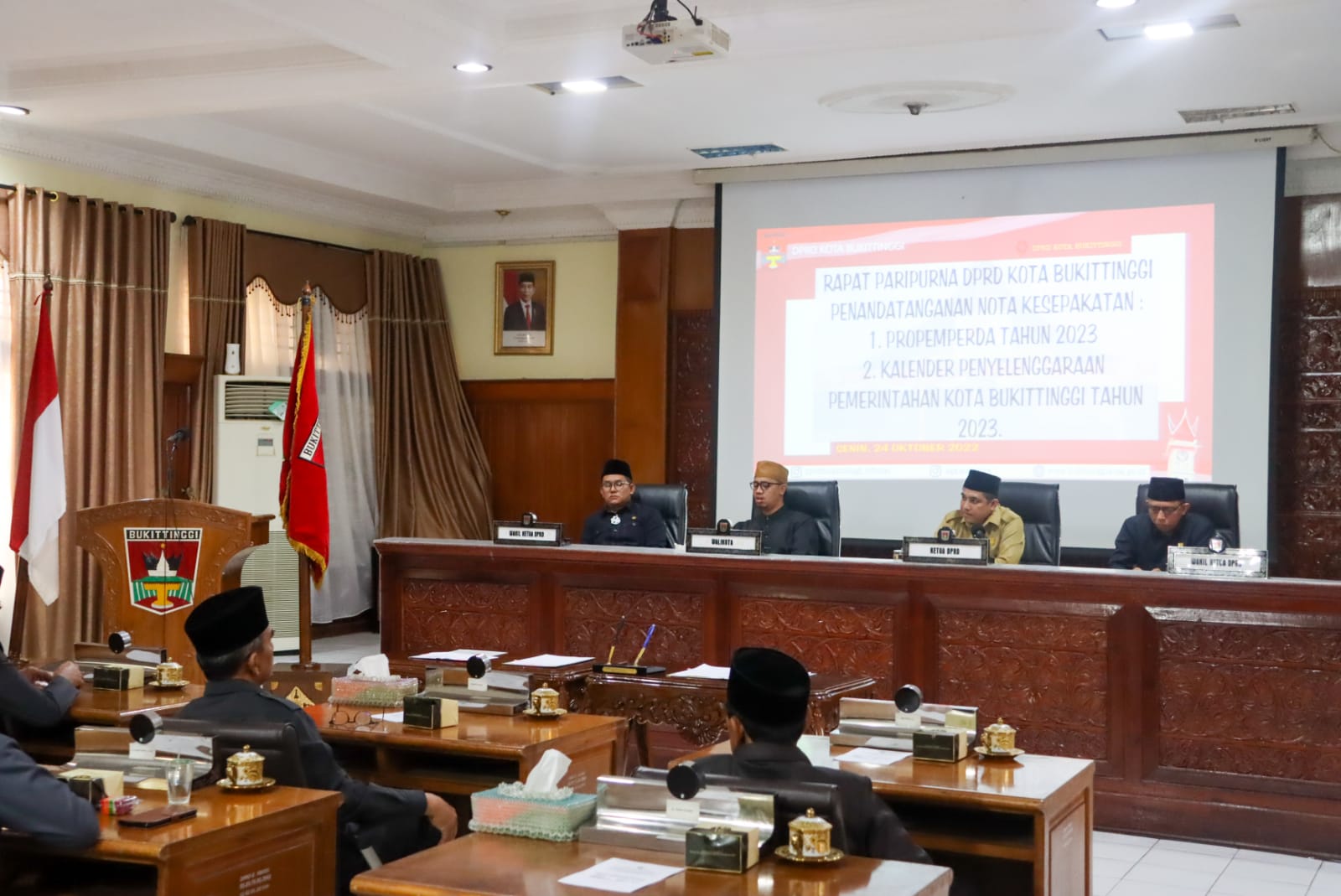 ” Hasilnya Disepakati 14 (empat belas) 3 (tiga) Inisiatif DPRD Kota Bukittinggi dan 11 (sebelas) Dari Pemerintah Daerah Kota Bukittinggi. Rancangan Peraturan Daerah Menjadi Program Pembentukan Peraturan Daerah. Semoga Pembangunan Hukum yang tertuang dalam Program Pembentukan Peraturan Daerah Tahun 2023 Nantinya Betul Betul Mampu Menjawab Kebutuhan Akan Pranata Hukum dan Perundang Undangan. yang tidak Lain dan tidak Bukan Sebagai upaya Peningkatan Kesejahteraan Warga Masyarakat dalam Segala dimensi Kehidupan. Disampaikan H. Erman Safar.. dalam Kata Sambutannya Hari Senin tanggal 24 Oktober 2022 di Ruangan Sidang DPRD Kota Bukittinggi. Dengan Ditandatanganinya Nota Kesepakatan Kalender Kerja Pemerintahan Daerah Kota Bukittinggi Tahun 2023. Yang Berarti Pemerintahan Kota Bukittinggi Telah Berkomitmen Untuk Melaksanakan Agenda Penyelenggaraan Pemerintahan dan Pembanggunan Kota Bukittinggi Tahun 2023. Hadir Pada Acara Ini Ketua , Wakil Ketua dan Anggota Dewan Perwakilan Rakyat Daerah Kota Bukittinggi, Anggota Forum Koordinasi Pimpinan Daerah, Ketua Pengadilan Negeri Bukittinggi, Ketua Pengadilan Agama Kota Bukittinggi, Sekretaris Daerah, Asisten Di Lingkungan Sekda, Kepala Dinas, .(Zlk)*
