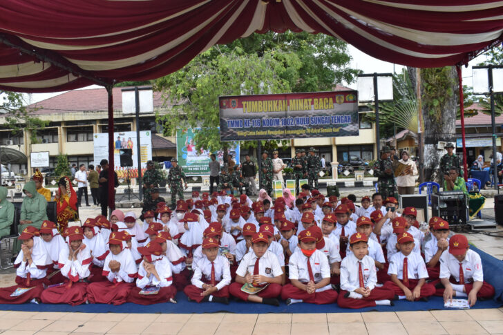 Barabai,metrotalenta.online–Satgas TMMD Ke-116 Kodim 1002 Tumbuhkan Minat Baca Kepada Siswa SD,Dalam rangka menyongsong generasi emas 2045, TMMD ke-116 Kodim 1002/HST berkerjasama dengan Dinas Perpustakaan daerah Kab. Hulu Sungai Tengah menggelar minat baca kepada siswa sekolah dasar pada saat upacara pembukaan TMMD. Rabu (10/05).