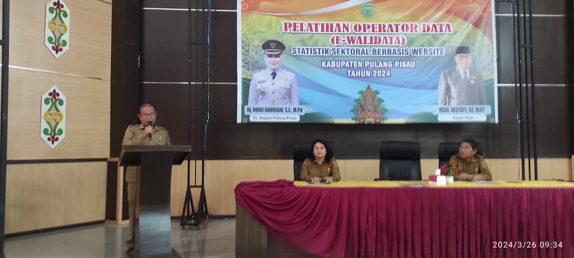 ‘Pada acara kegiatan pelatihan operator data (e-walidata) statistik sektoral berbasis website kabupaten pulang pisau tahun 2024.pelatihan ini merupakan wujud tindak lanjut implementasi satu data indonesia di kabupaten pulang pisau provinsi kalteng atas ditetapkannya peraturan presiden nomor 39 tahun 2019 tentang satu data indonesia.dalam era keterbukaan informasi publik seperti sekarang ini, data memiliki fungsi yang sangat strategis, yakni selain sebagai dasar suatu perencanaan dan membuat keputusan juga sebagai alat pengendali serta evaluasi terhadap pelaksanaan suatu pembangunan.