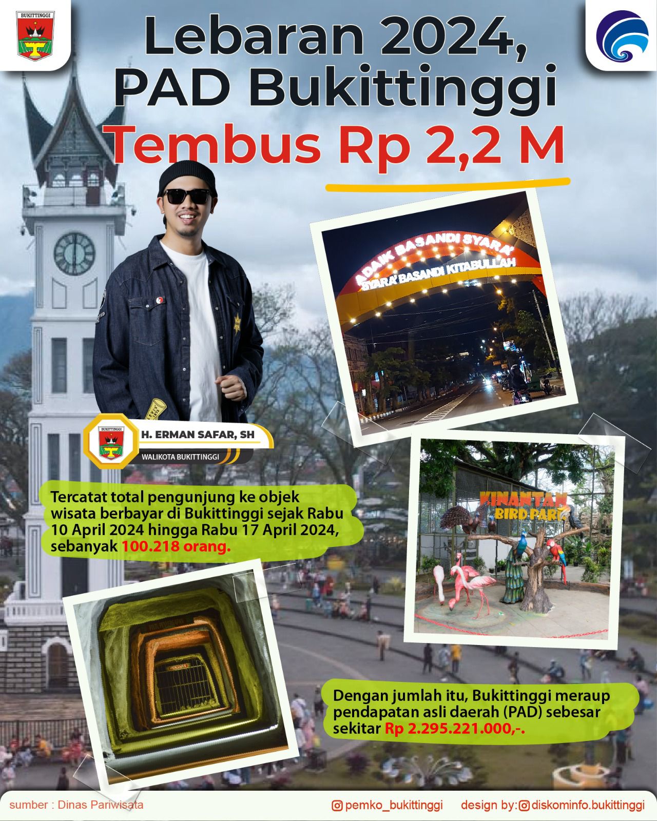 Bukittinggi,Metrotalenta.online,– Selama lebaran Idul Fitri 1445 H tahun ini, Pemerintah Kota Bukittinggi telah mencatat kunjungan wisata selama libur Lebaran 1445H mencapai 100 ribu lebih wisatawan datang berkunjung ke tiga tempat wisata primadona Kota Bukittinggi. Dari jumlah tersebut Pendapatan Asli Daerah (PAD) yang terkumpul mencapai Rp2,2 miliar lebih.