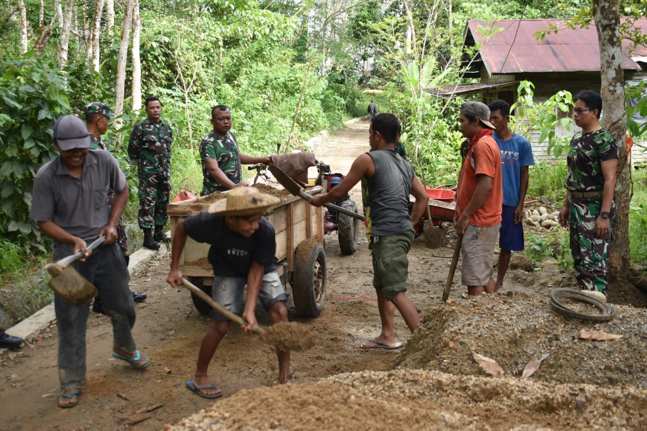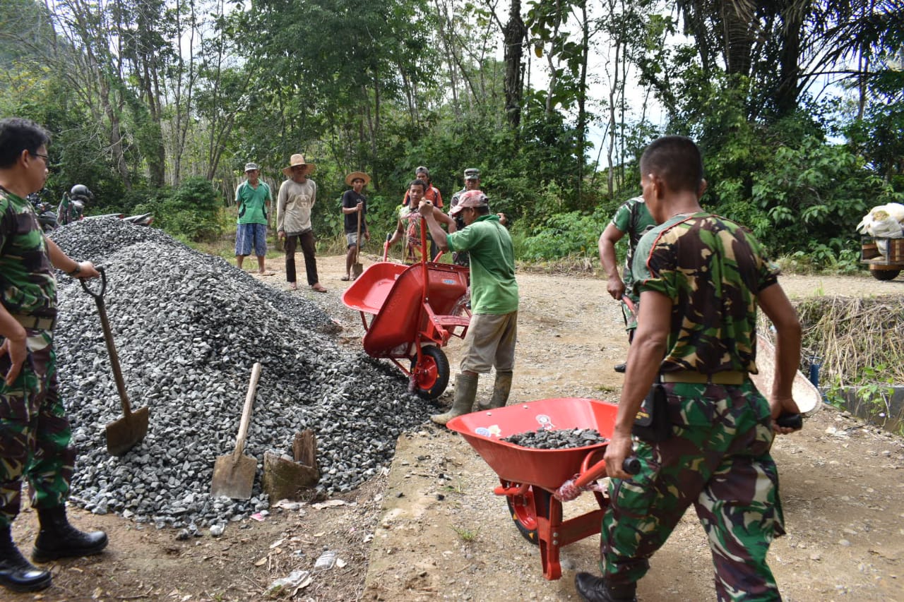 Hal ini tampak saat anggota Satgas TMMD bersama warga desa Hapulang mengangkut pasir, split dari titik nol. Sabtu (06/05).