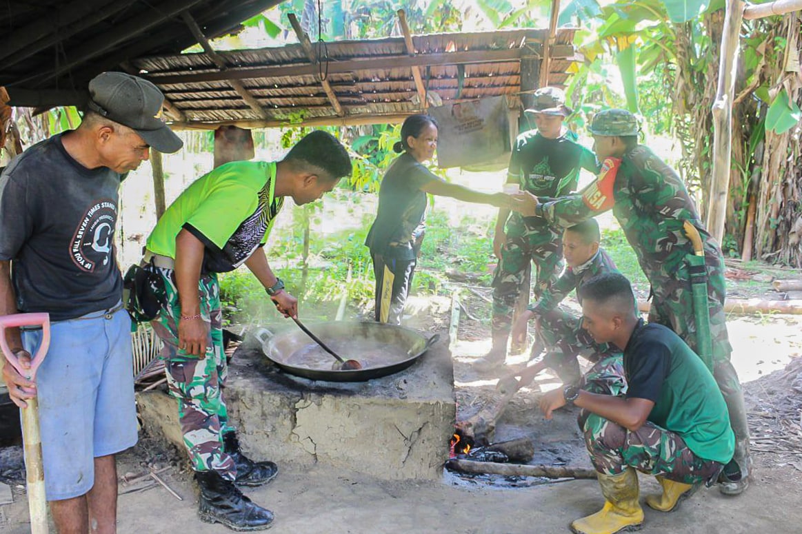 Bentuk dukungan anggota Satgas TMMD ke 114 Kodim 1306/Kota Palu membantu Ibu Fatma memasak gula aren di Dusun 1, Desa Siaga, Kecamatan Tinombo Selatan, Kabupaten Parimo. Sabtu (13/8).