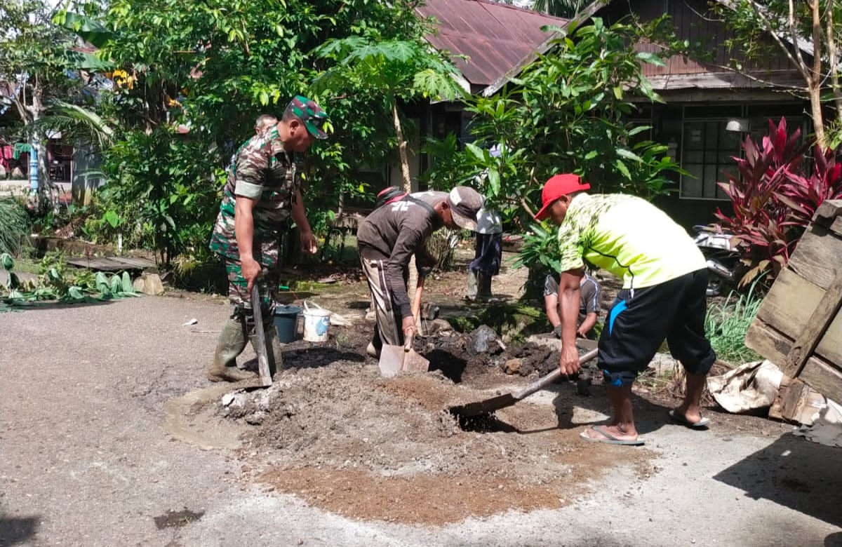 Barabai,Metrotalenta.online–Babinsa Koramil 1002-03/Haruyan Serda Yunus Suyanto bersama Aparat Desa memperbaiki jalan berlubang dengan semenisasi.Jum’at (18/11).