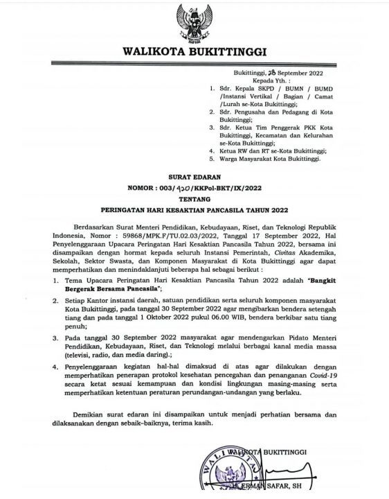 Surat edaran tentang Hari Kesaktian Panca Sila dikeluarkan Wako Bukittinggi