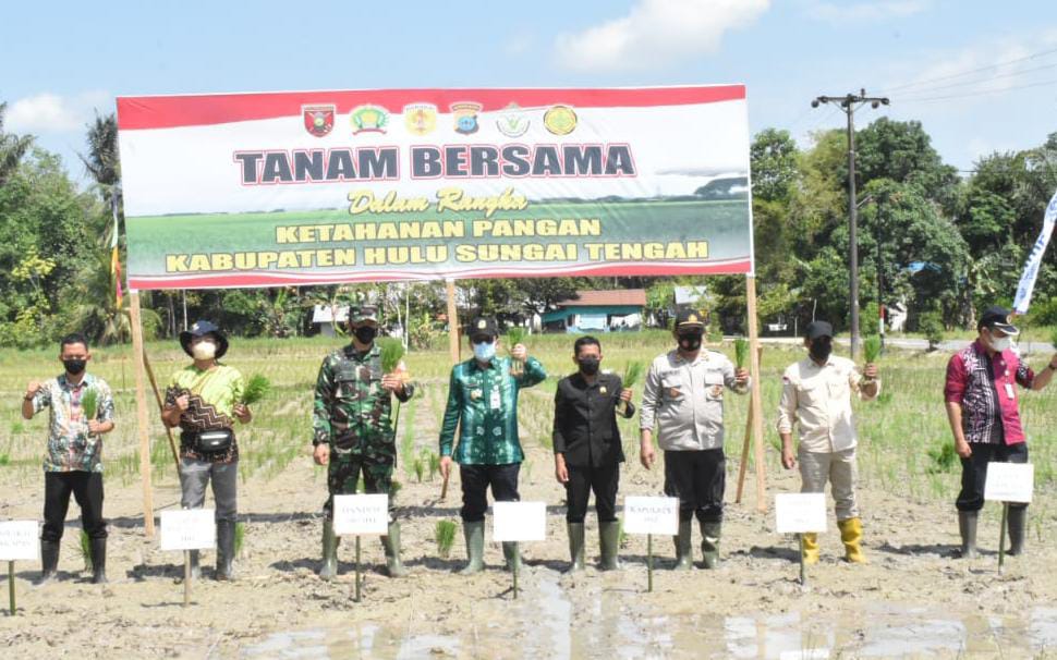 Salah satunya adalah kegiatan tanam bersama bibit padi jenis Mikongga oleh unsur Forkopimda Hulu Sungai Tengah di Desa Bakapas Kecamatan Barabai Kab.HST Kalimantan Selatan.Kamis (31/3).