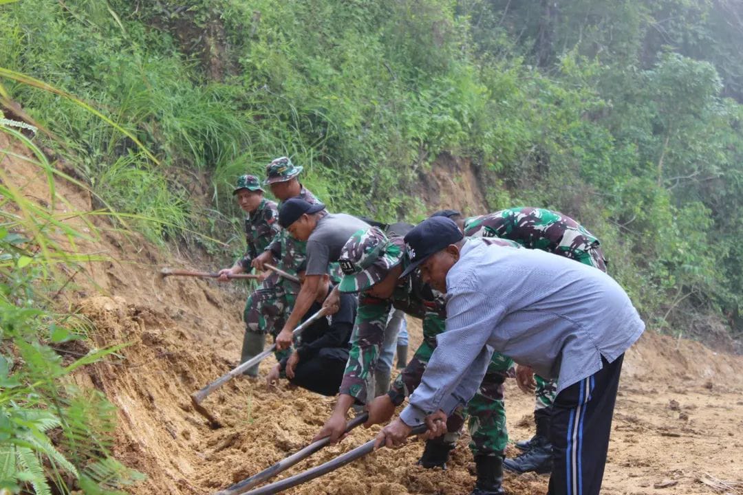 Minggu (15/2/2026), di sisi kiri dan kanan badan jalan yang mulai terbentuk, tangan-tangan prajurit dan masyarakat bergerak serempak, merapikan bahu jalan, mengangkat sisa material, dan meratakan tanah.