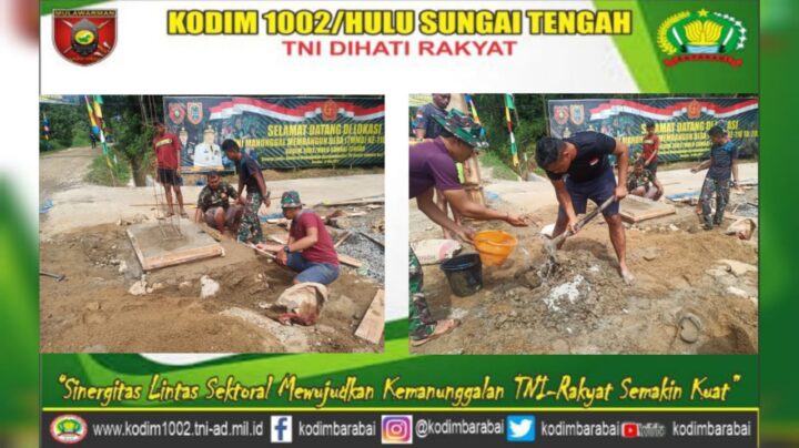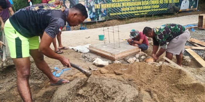 Barabai,Metrotalenta.online–TNI Bangun Tugu TMMD Ke 16 Di Desa Hapulang,Jelang berakhirnya program TNI Manunggal Membangun Desa (TMMD) ke-116 Kodim 1002/HST di Desa Hapulang Kecamatan Haruyan Kabupaten Hulu Sungai Tengah, personil Satuan Tugas (Satgas) dan warga membangun Tugu TMMD. Minggu (04/6/2023).