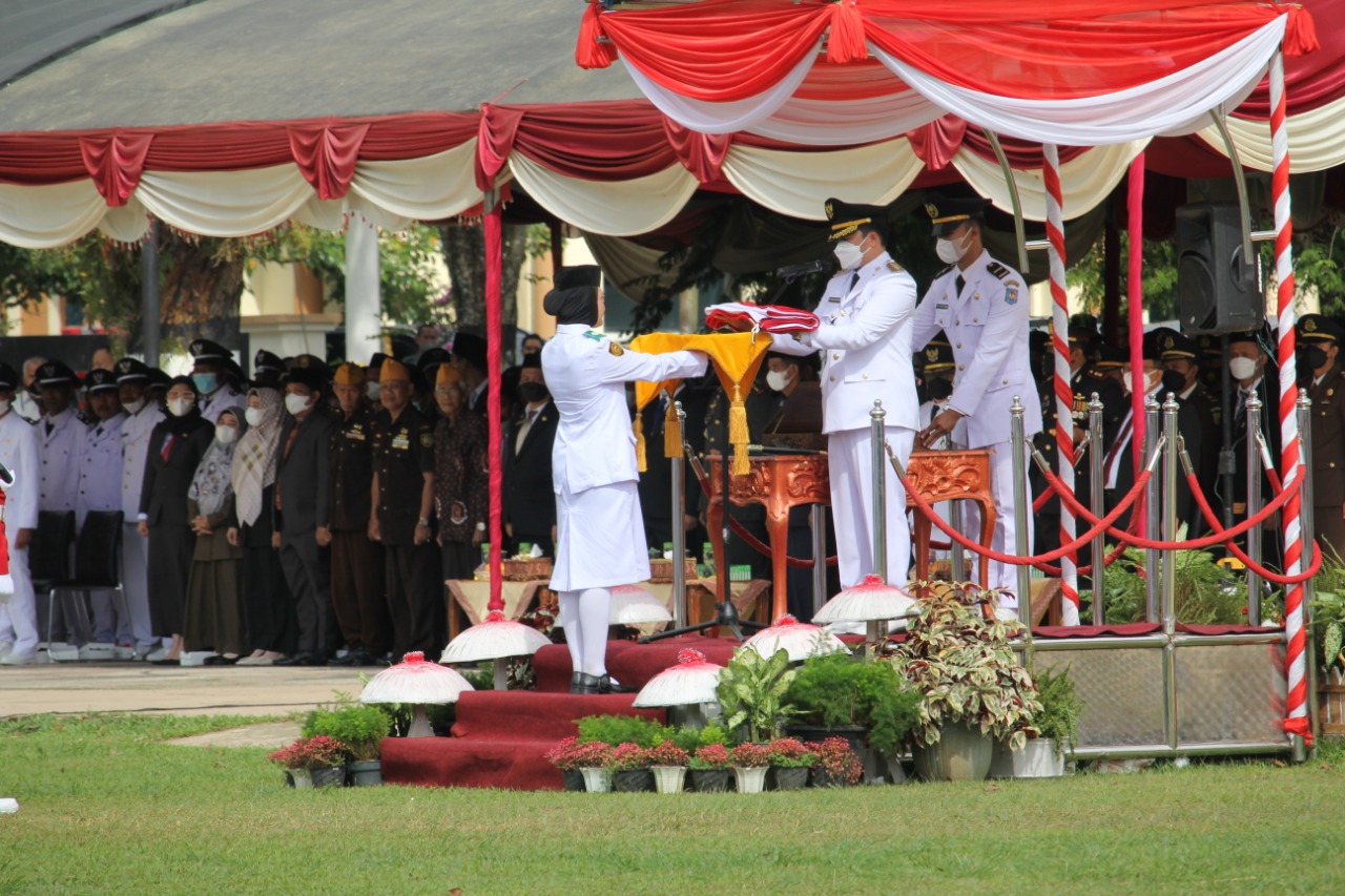 Barabai,Metrotalenta.online–Upacara Detik-detik Peringatan Proklamasi Kemerdekaan Republik Indonesia di Hulu Sungai Tengah berlangsung di Lapangan Dwi Warna Barabai dengan inspektur upacara Bupati HST H.Aulia Oktafiandi.ST.,M.AppCom berjalan dengan lancar.Rabu (17/08).